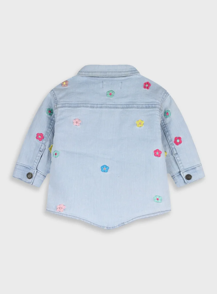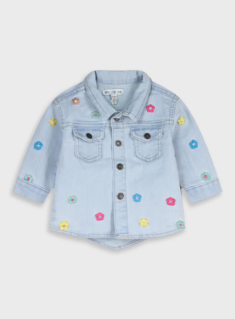 Casaca de ganga para menina, com flores bordadas e fecho de mola