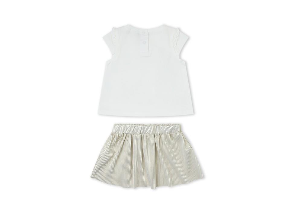 Conjunto de menina composto por duas peças. Saia plissada dourada, com cintura elástica, 100% Poliéster, destacando-se pelo seu acabamento elegante e brilho subtil. A t-shirt 95% Algodão e 5% Elastano, apresenta uma aplicação floral e brilhantes, garantindo conforto com um toque delicado e moderno.